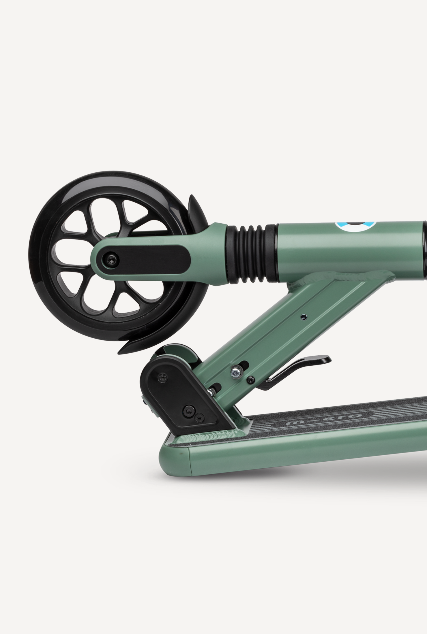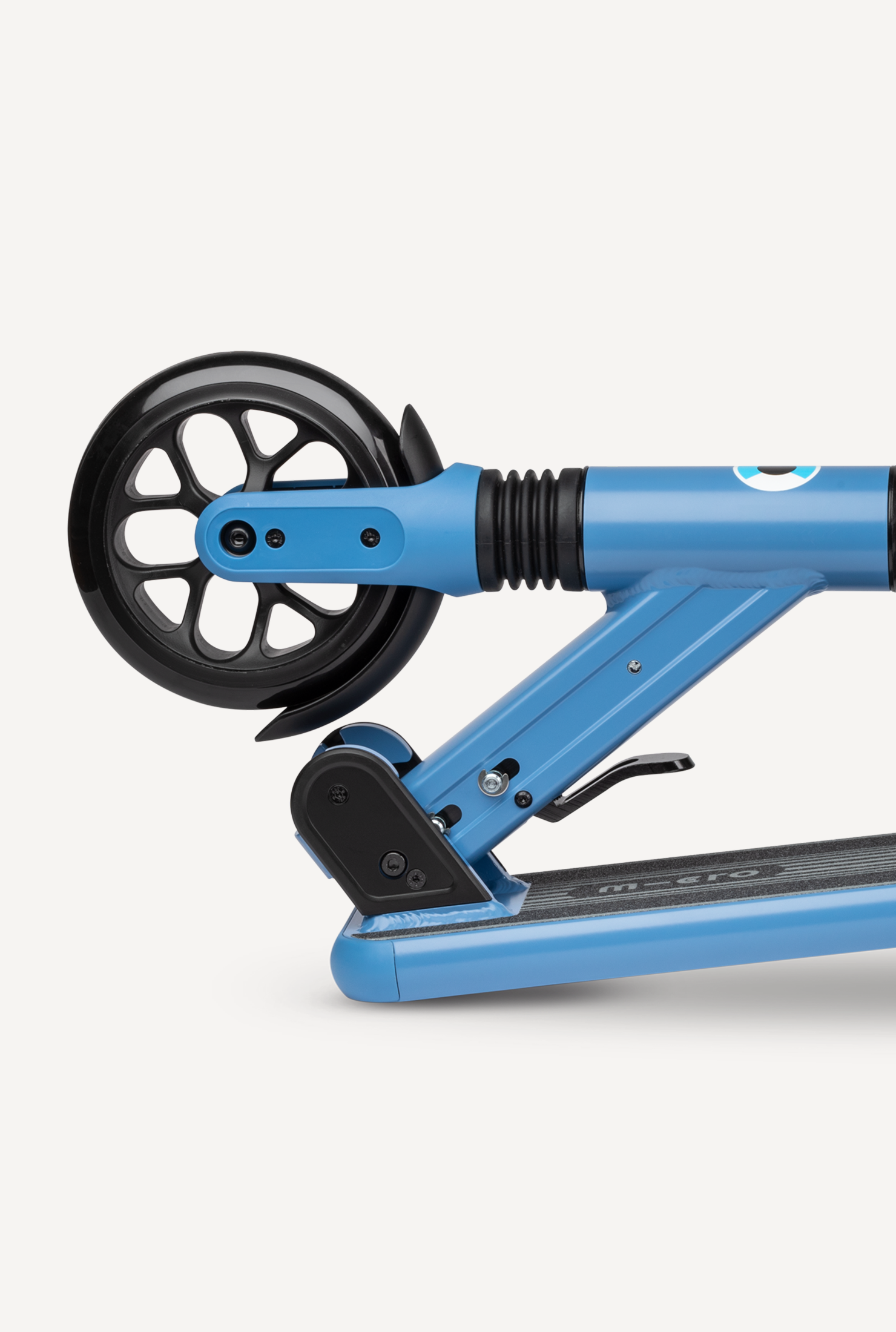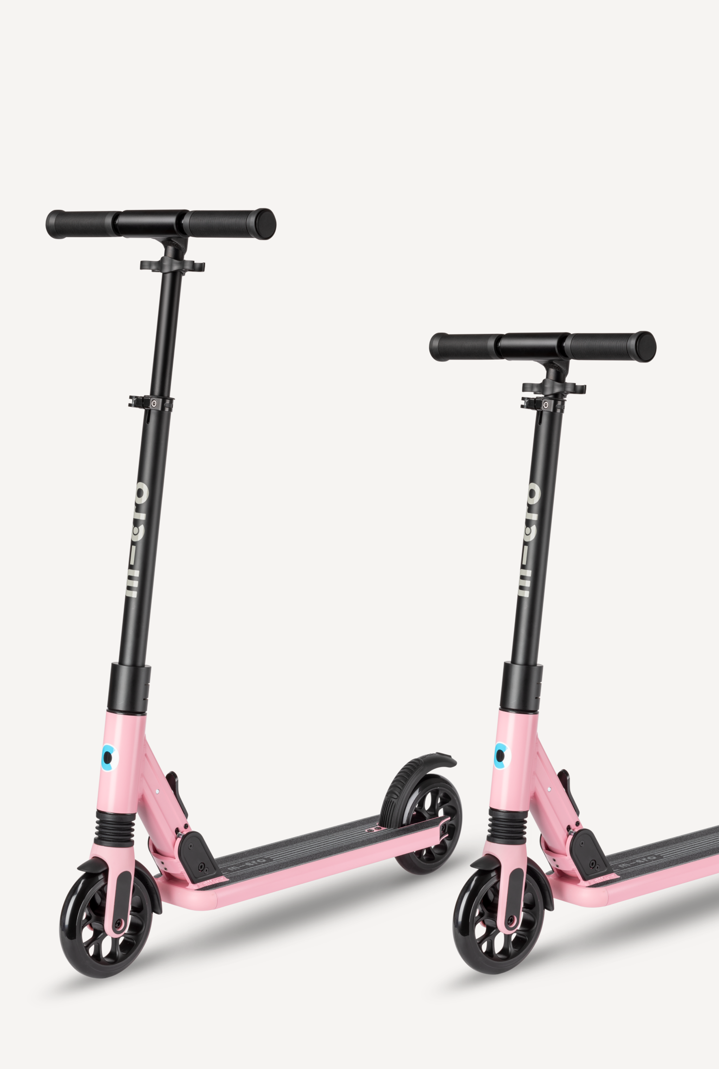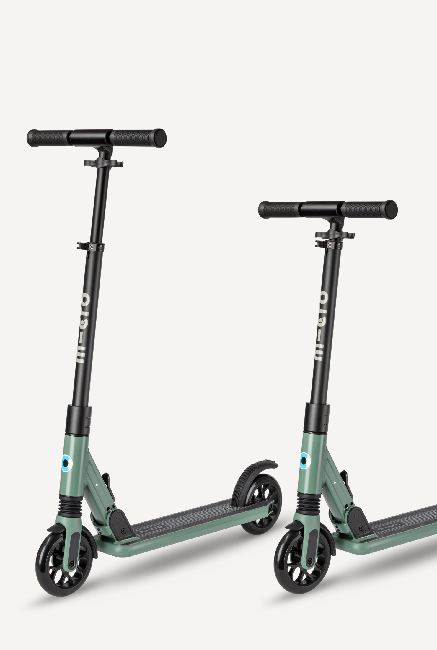 The main differences between two-wheeled scooters and three-wheeled kickboards come down to steering method, balance, and wheel size. Two-wheel scooters use handlebar steering, where riders turn the handlebars like on a bike. This offers quicker, more precise control—great for navigating crowded areas—but requires more balance and coordination, so they’re best for ages 6 and up. Three-wheel kickboards (like the Mini, Maxi, and Kickboard Reloaded) use Micro’s lean-to-steer method, where riders lean their body to turn. This active style promotes stability, smooth, surf-like turns, and helps children develop natural weight-shifting skills. Plus, a three-wheel kickboard stands upright on its own—ready to jump on or off anytime.