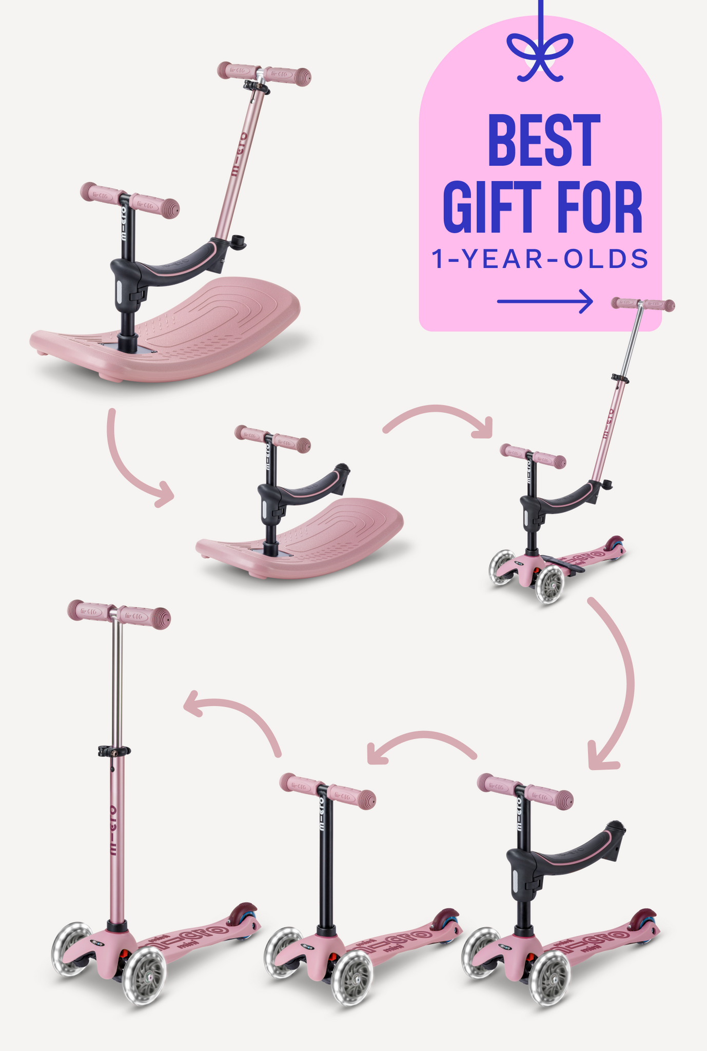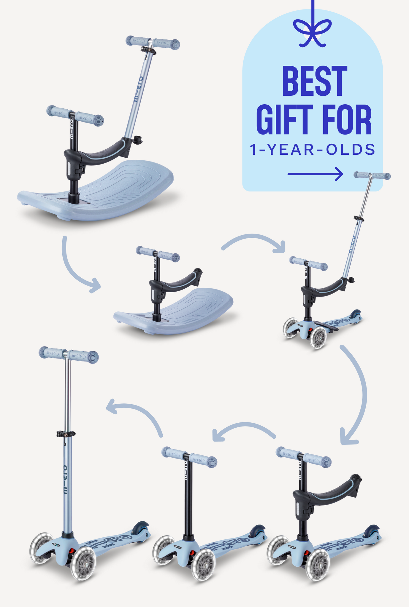 Stage 3: By moving the seat/T-bar combo to the Mini scooter base, kids can take their first ride on wheels—rolling forward while a parent provides support with the push bar.