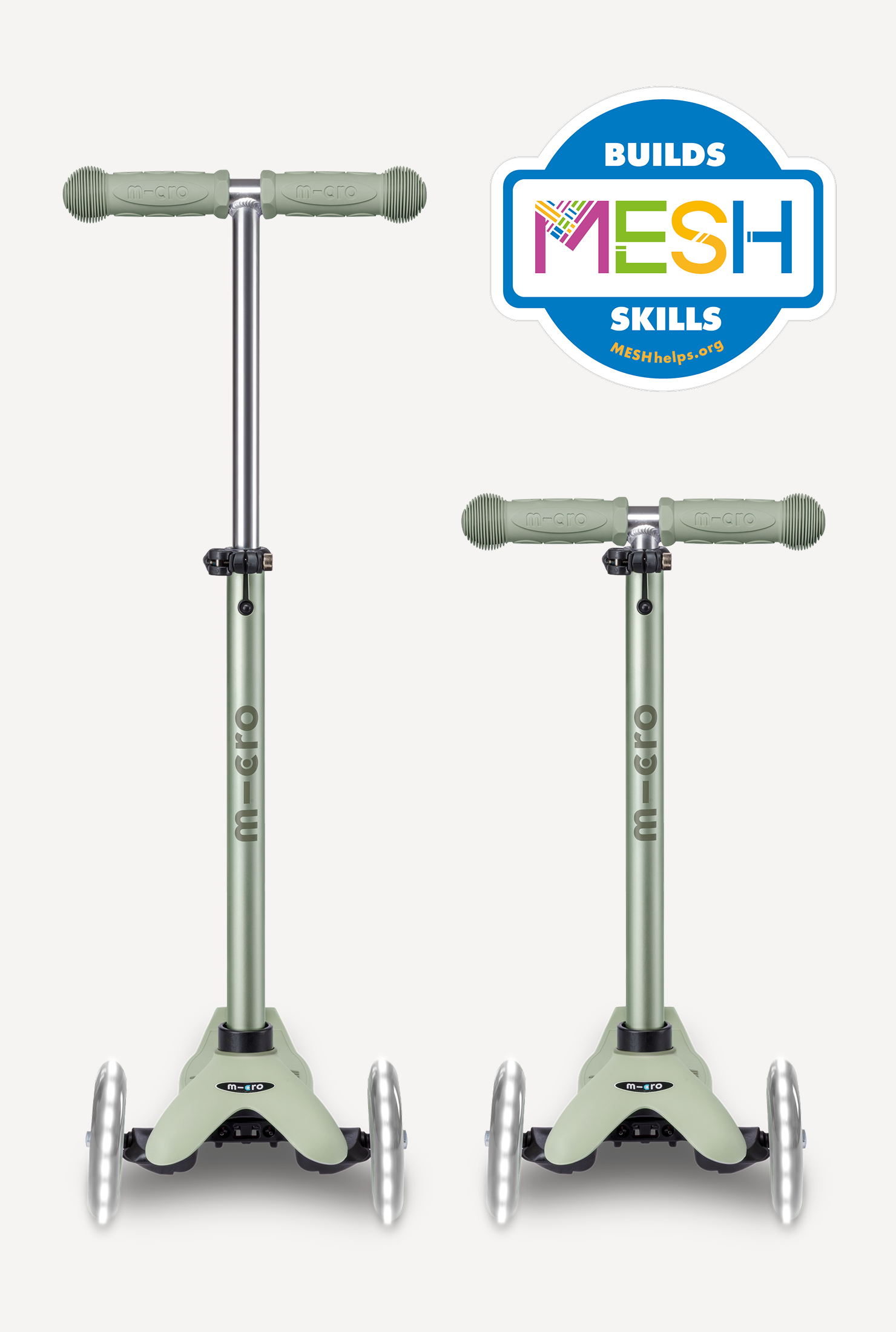 Stage 3: By moving the seat/T-bar combo to the Mini scooter base, kids can take their first ride on wheels—rolling forward while a parent provides support with the push bar.