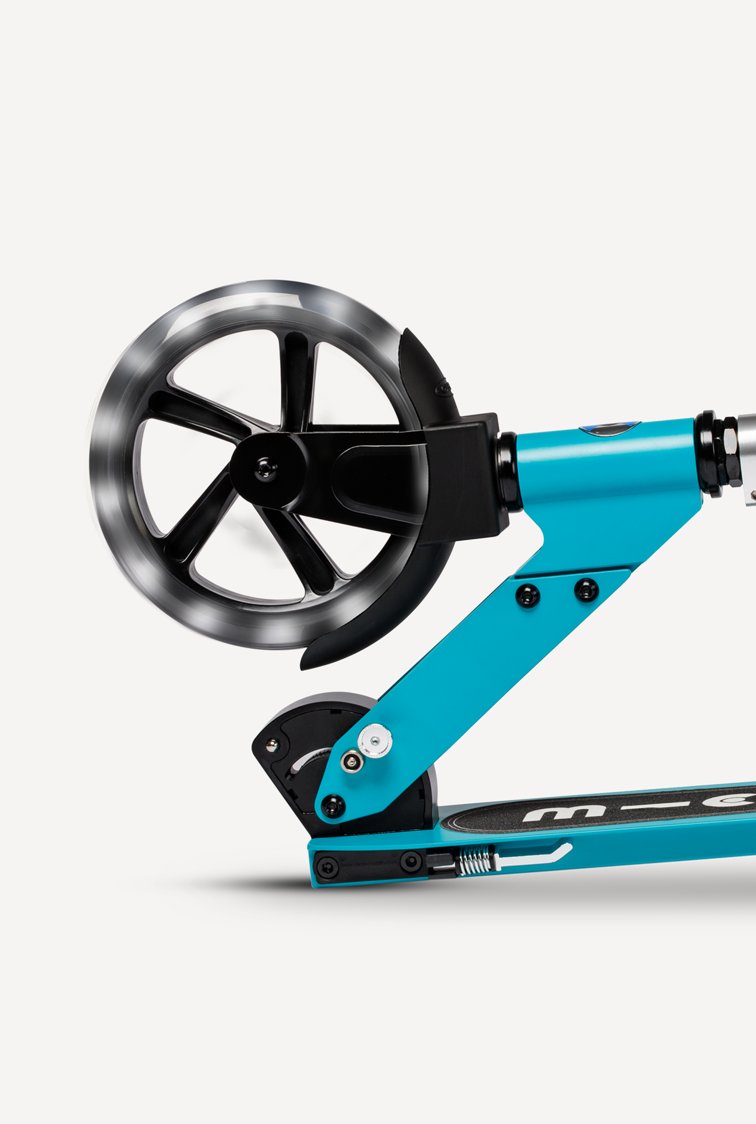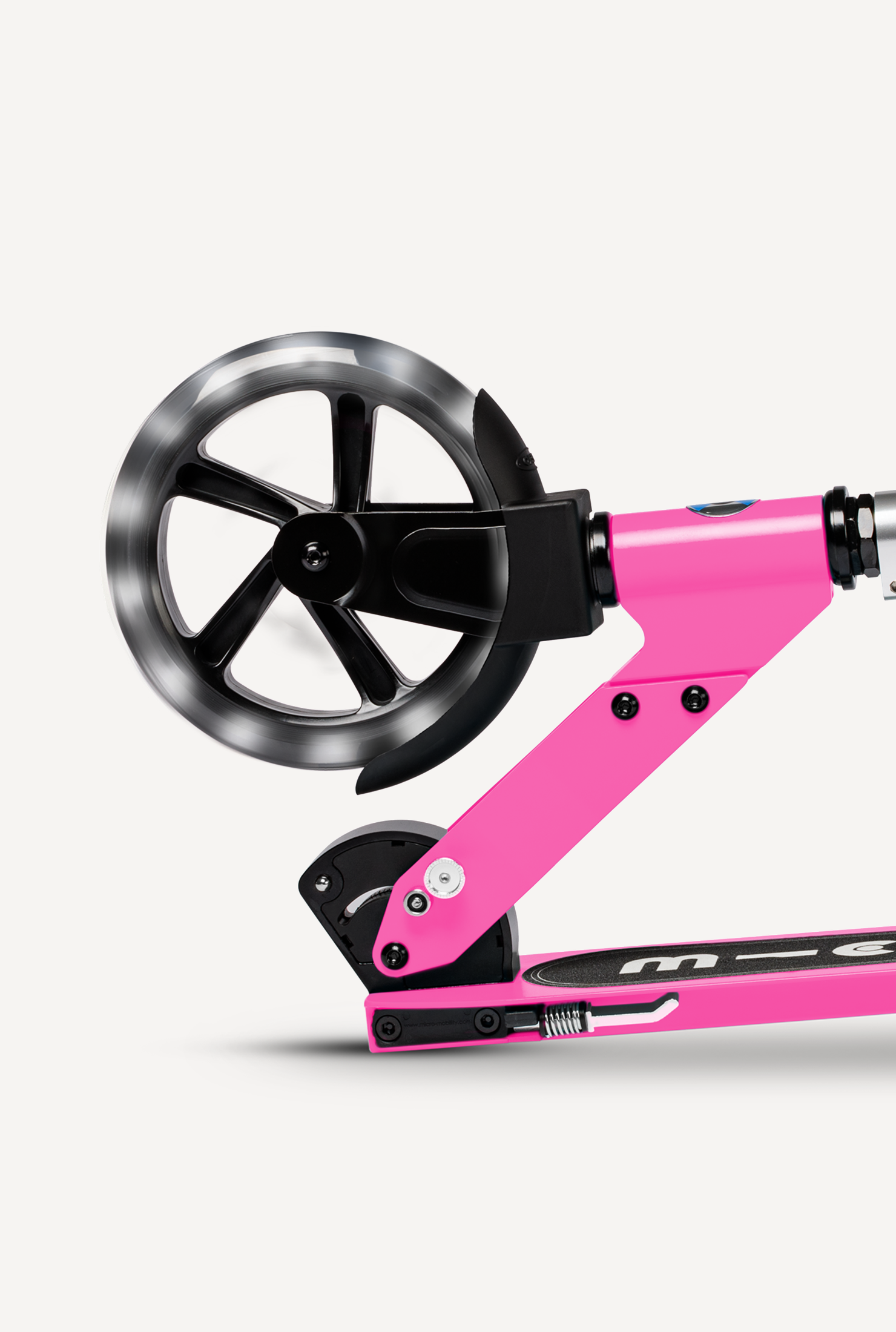 Equipped with larger wheels and a chopper-style handlebar, this design allows riders to turn easily and scoot further, faster. The motion-activated LED wheels light up with each rotation, adding a memorable touch to every ride (no batteries needed).