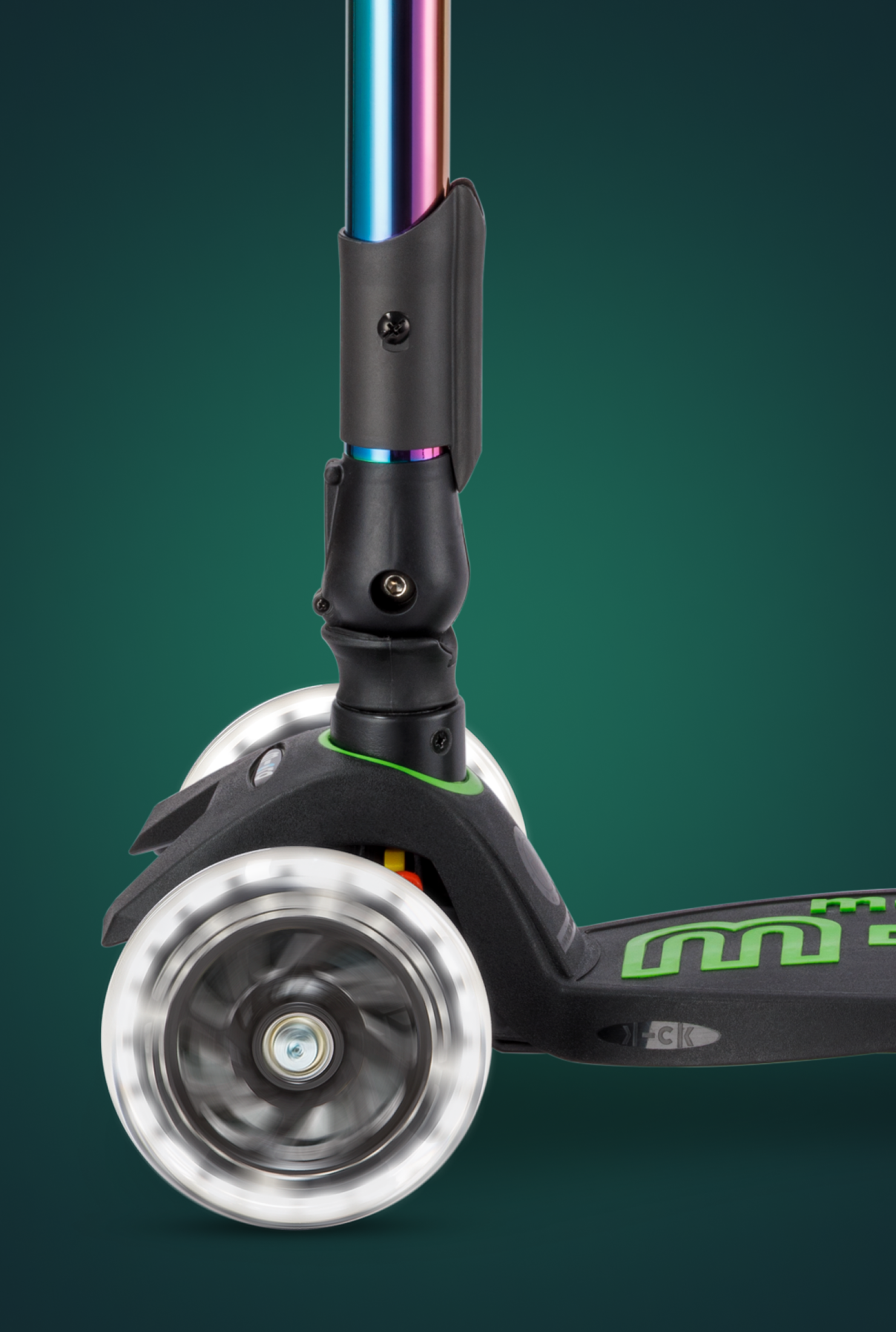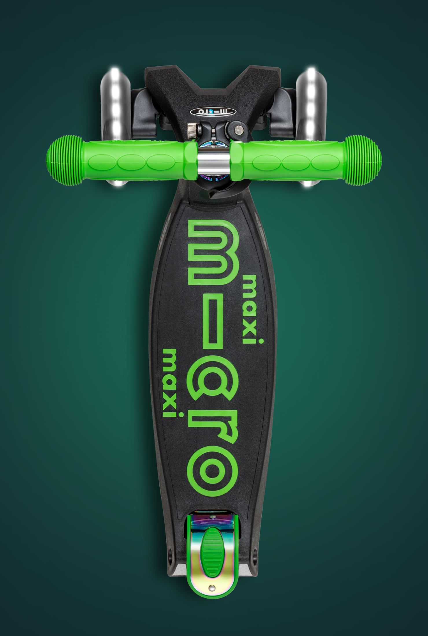 The Maxi Foldable LED Scooter in neochrome combines Micro's trusted lean-to-steer design with a striking, color-shifting look. Kids steer by leaning side to side, helping them build balance and confidence with every ride. Bright silicone lettering pops against the black deck, adding eye-catching style and extra grip for a smooth glide.