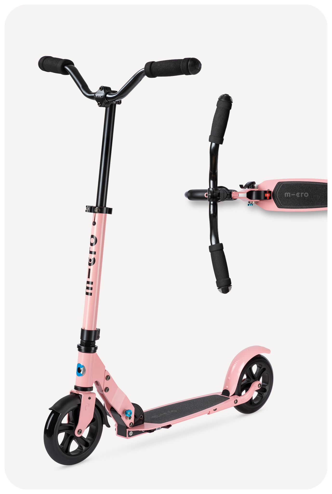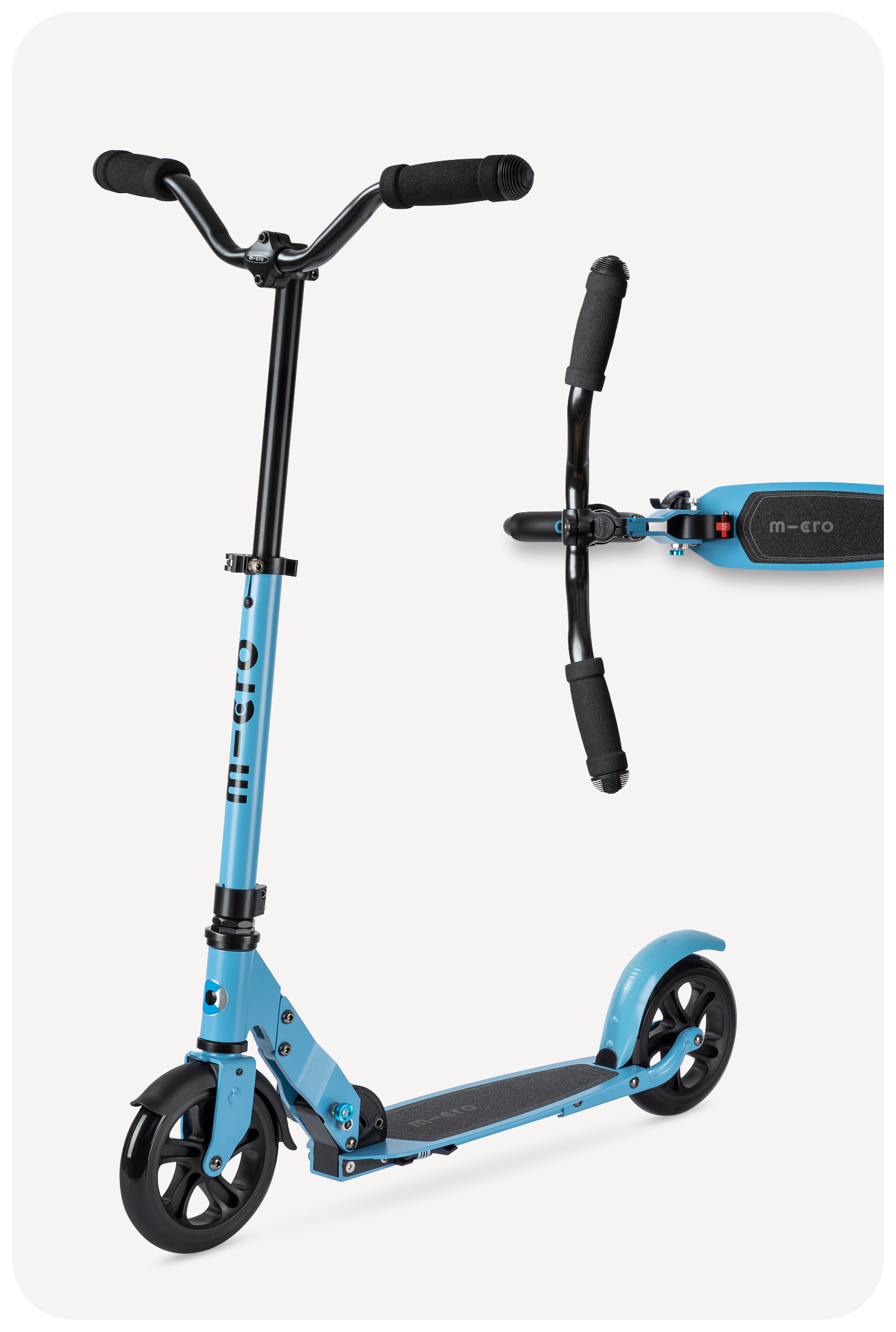 Micro’s classy two-wheeled scooter, designed with large wheels to go further, faster and chopper-style handlebars for a comfortable, relaxed grip.