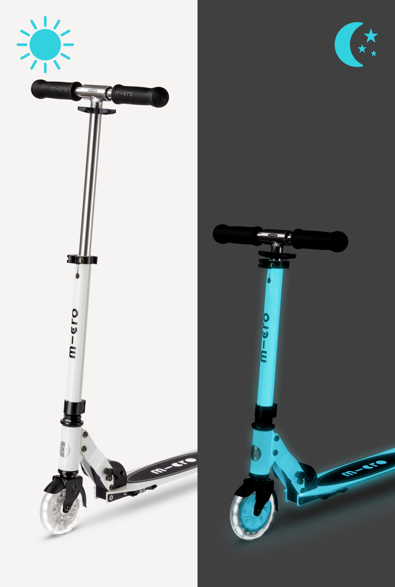 With its foldable T-bar, trusted two-wheel design, and updated premium-rubber collapsible handgrips, this scooter is built for both excitement and convenience. Watch your rider’s face light up as their ride transforms from sleek white to a glowing showstopper—turning every ride into a moment to shine.