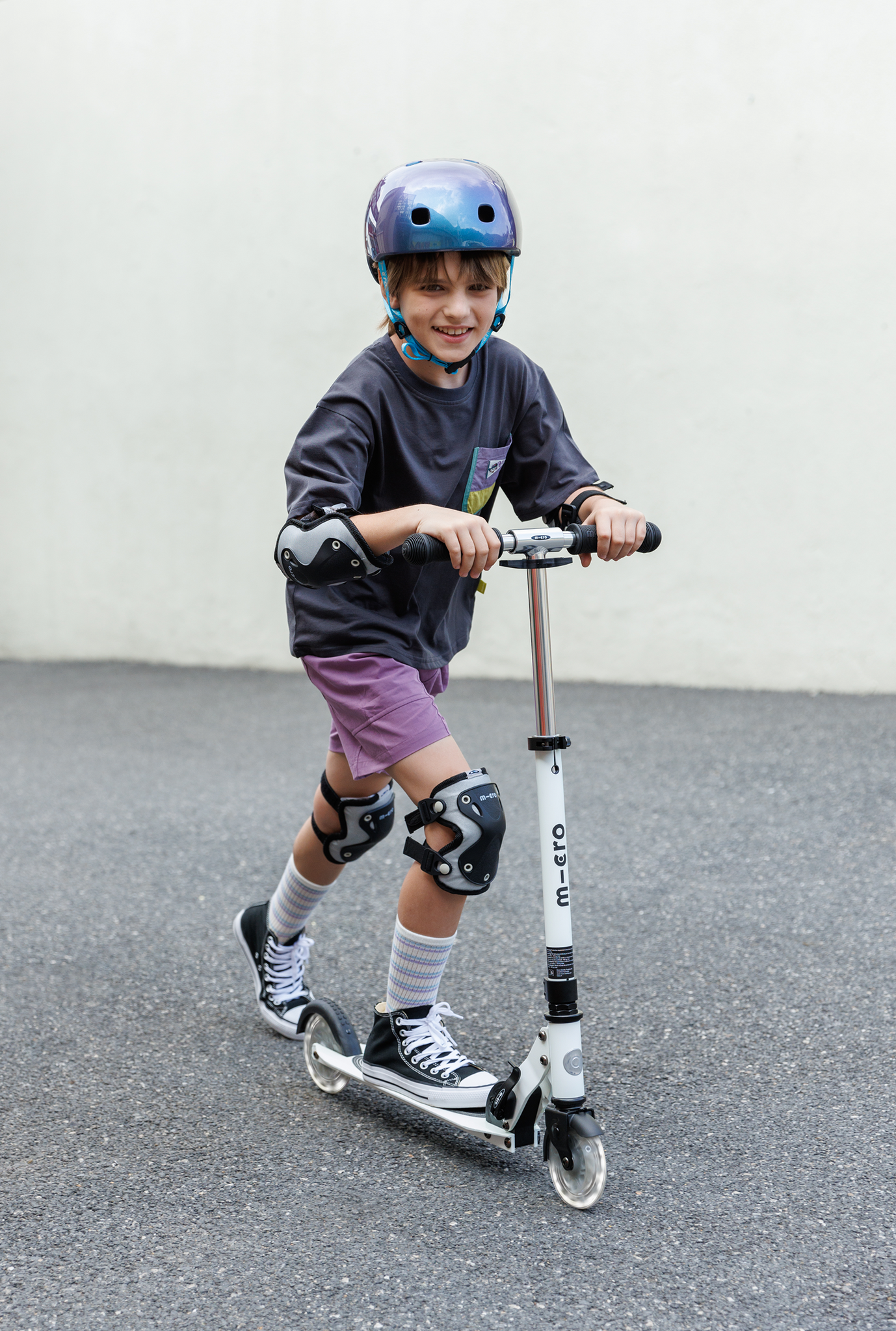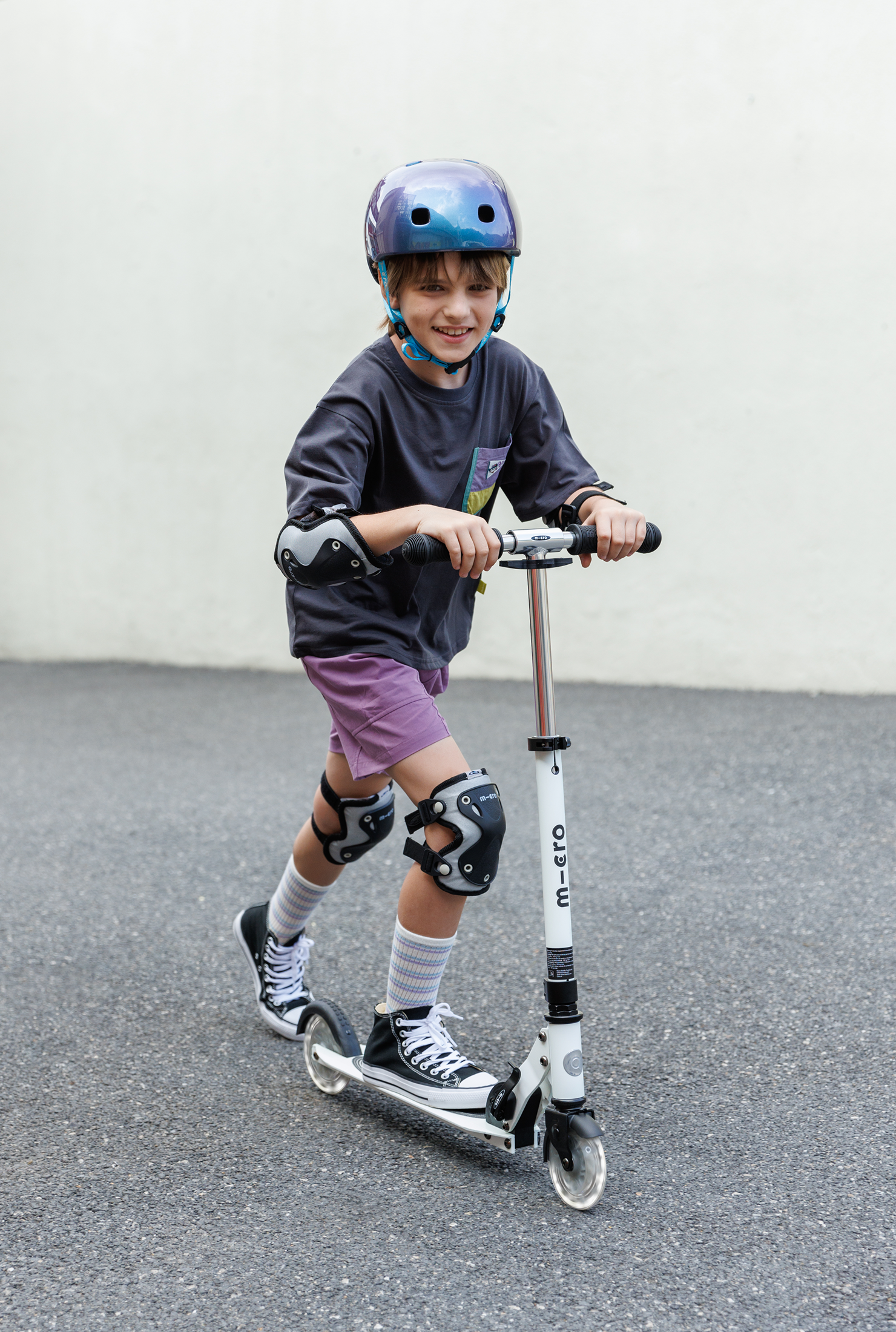 The main differences between two-wheeled scooters and three-wheeled kickboards come down to steering method, balance, and wheel size. Two-wheel scooters use handlebar steering, where riders turn the handlebars like on a bike. This offers quicker, more precise control—great for navigating crowded areas—but requires more balance and coordination, so they’re best for ages 6 and up. Three-wheel kickboards (like the Mini, Maxi, and Kickboard Reloaded) use Micro’s lean-to-steer method, where riders lean their body to turn. This active style promotes stability, smooth, surf-like turns, and helps children develop natural weight-shifting skills. Plus, a three-wheel kickboard stands upright on its own—ready to jump on or off anytime.